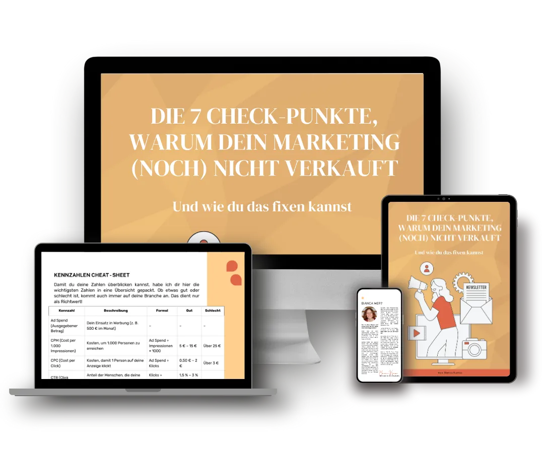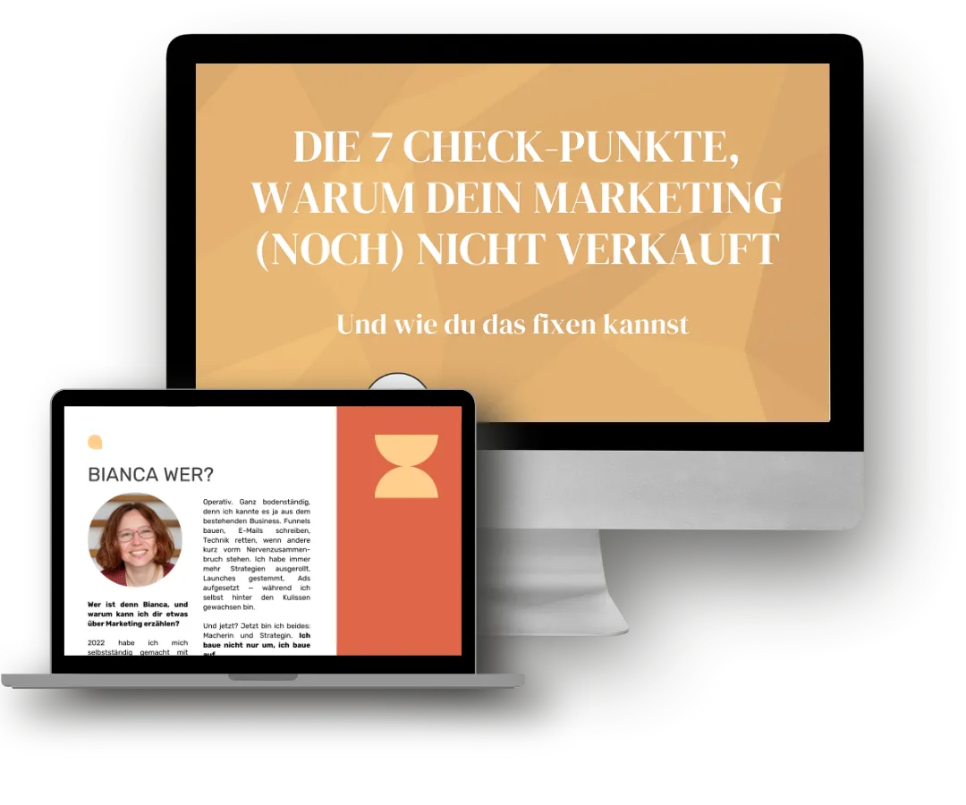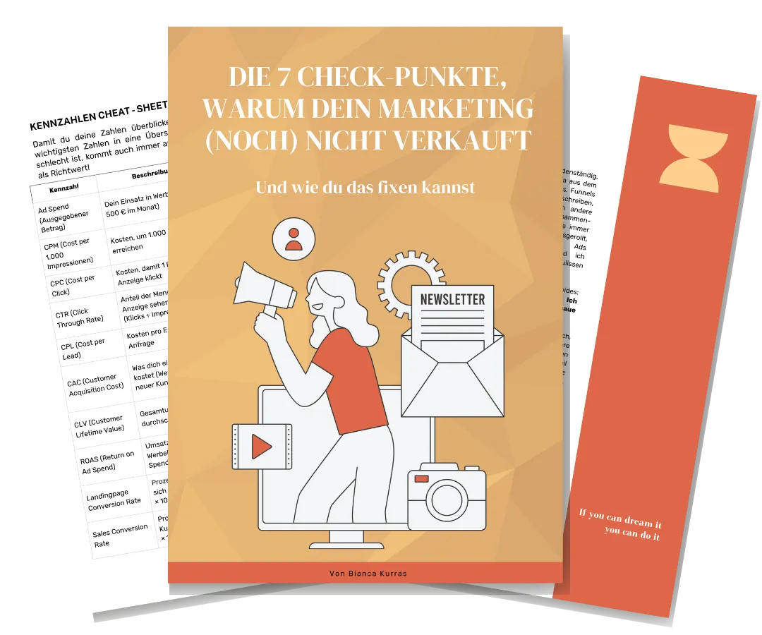 2021 habe ich mich nebenberuflich selbstständig gemacht als Coach. Ich habe mir alles Wissen rund um Marketing und Sales durch Kurse und Mentoren gesammelt, viel selbst ausprobiert und wurde immer wieder gefragt: "Bianca, wo fange ich überhaupt an und was ist wichtig? Was brauche ich denn überhaupt alles?"