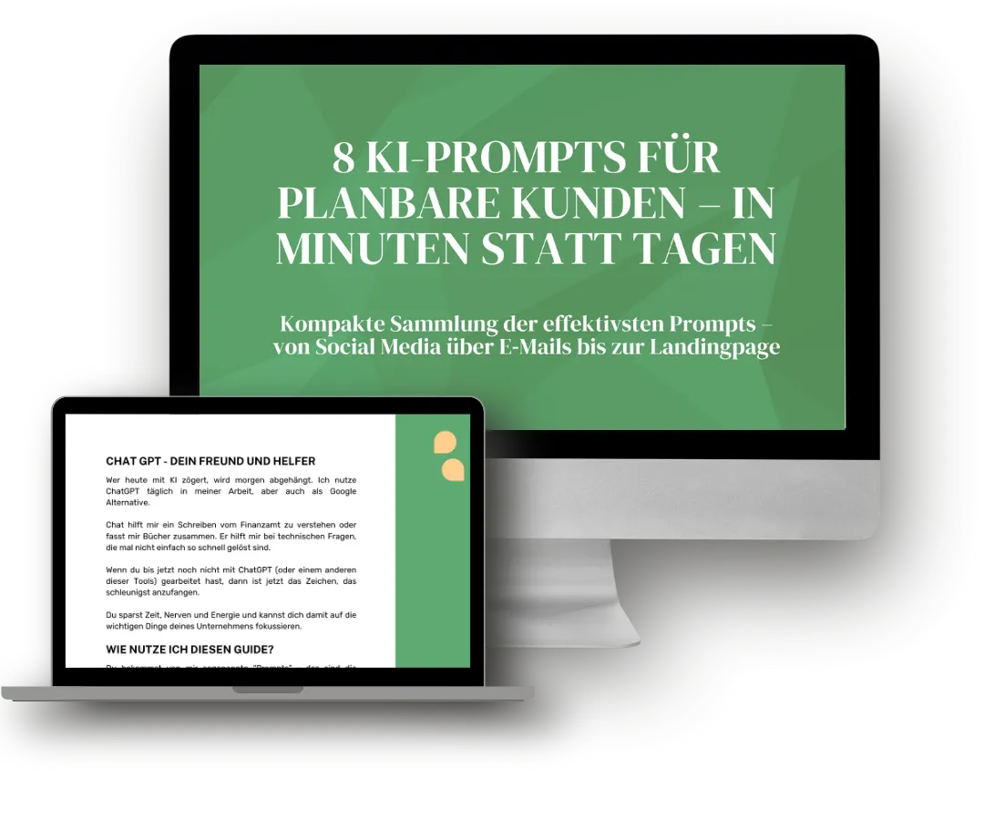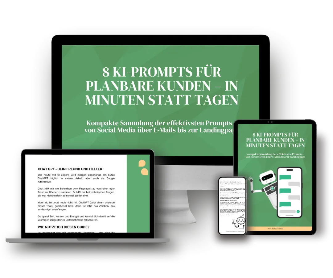 Kostenloses E-Book "8 KI-Prompts für planbare Kunden – in Minuten statt Tagen", nur für kurze Zeit kostenfrei verfügbar.
